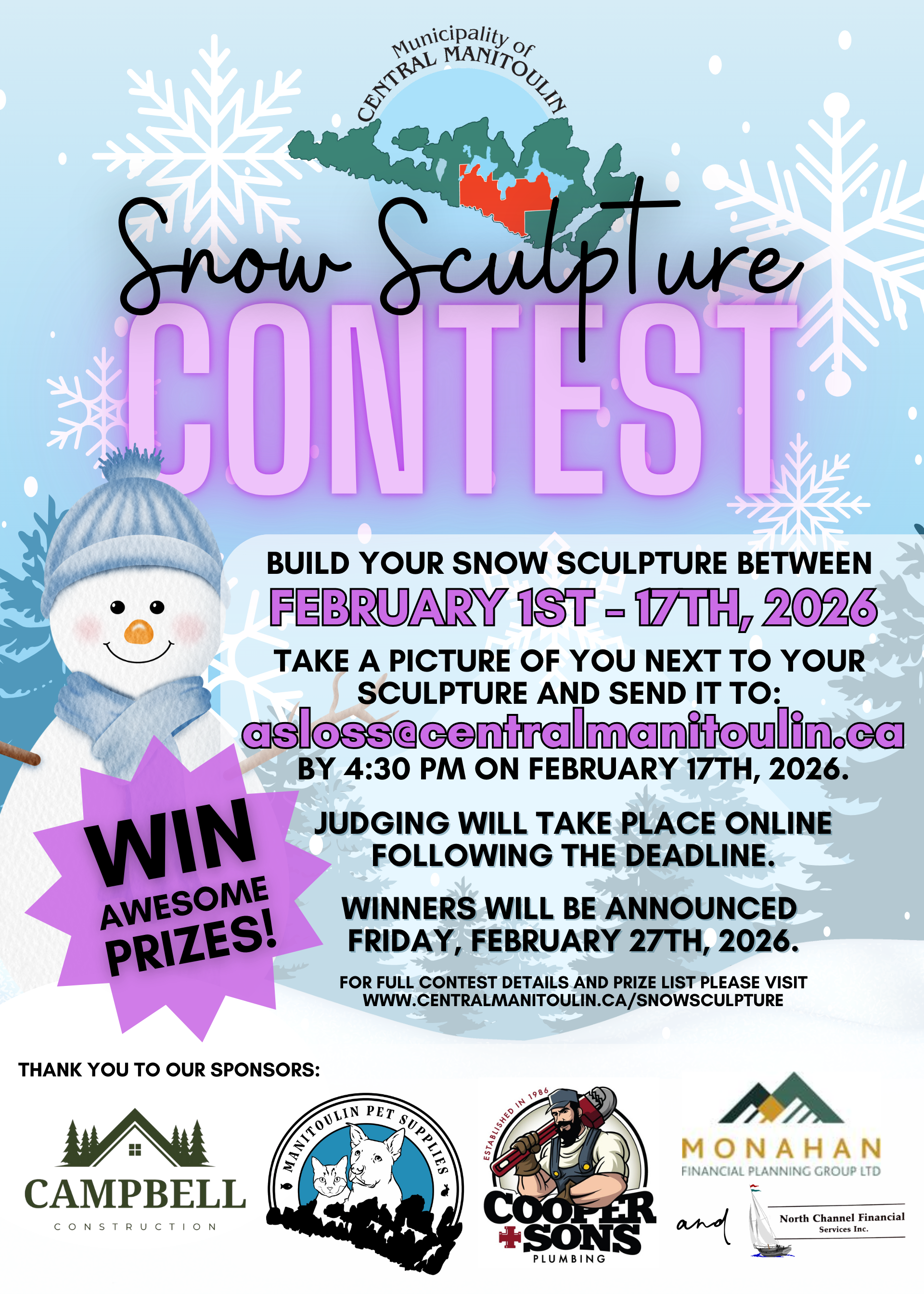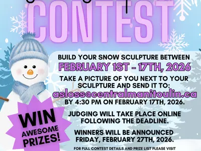 Central Manitoulin Snow Sculpture Contest - Get your family and friends together and build your best snow sculpture between February 1st - February 17th, 2026. Take two pictures, one of just your sculpture and one of you or your family standing next to it and send your name, address and your pictures to asloss@centralmanitoulin.ca before 4:30 pm on February 17th, 2026 to enter to win some cool prizes.